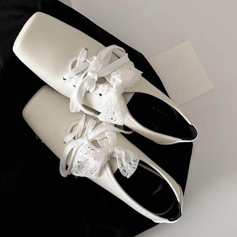 Vintage Lace Mary Jane Small Leather Shoes Women's Square Head Thick Heel Lace-up Ballet Shoes Single Shoes