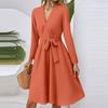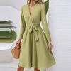 Women's Fashion Casual V-Neck Long Sleeve Waist Solid Color Midi Dress