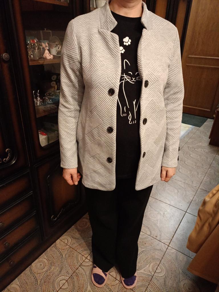 My size is 46. I specifically took my measurements before ordering. The fabric isn't super, but it's acceptable. Not a bad blazer for warm spring-autumn weather. The size corresponds, but it pulls somewhere in places. Perhaps the reason is in the patterns.