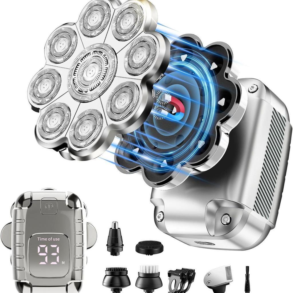 9D Smooth Shaving Heads: This head shaver for bald men is equipped with 9 floating heads and has been carefully ergonomically designed to fit the curves of your scalp, neck and face perfectly and gently, giving you a precise and smooth shaving experience. Combined with a powerful high-speed motor, this electric shavers for men can quickly and efficiently remove more hair, significantly reducing shaving time, allowing you to easily cope with daily care in your busy life.