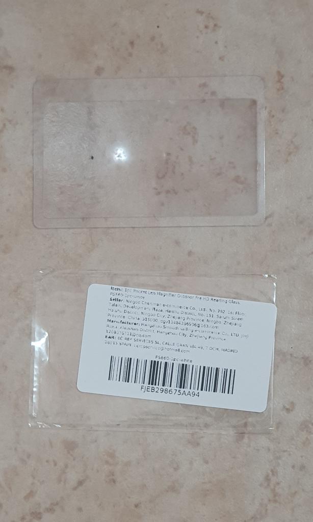 An amazing gadget, it fits in the side pocket of a wallet, magnifies only twice, but it's flat and large in area. Very satisfied, in the store sometimes the font on the packaging is very small