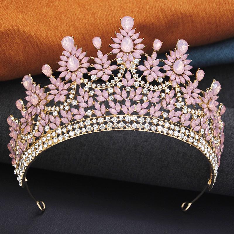 Elegant High Opal Pink Crown Royal Queen Tiaras and Crowns Wedding Hair Jewelry Party Prom Diadem Pageant Headdress Bridal