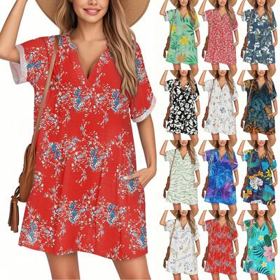 Women's Fashion Smock Hawaiian Floral Casual Short Sleeve V-neck T-shirt Dress Holiday Beach Dress