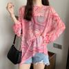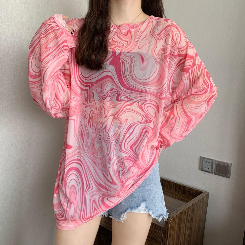 Tie-Dye Water Wave Pattern Mesh Sun Protection Cover-up Summer Trendy Korean Style Loose Long-sleeve Internet Celebrity T-shirt Sheer Top