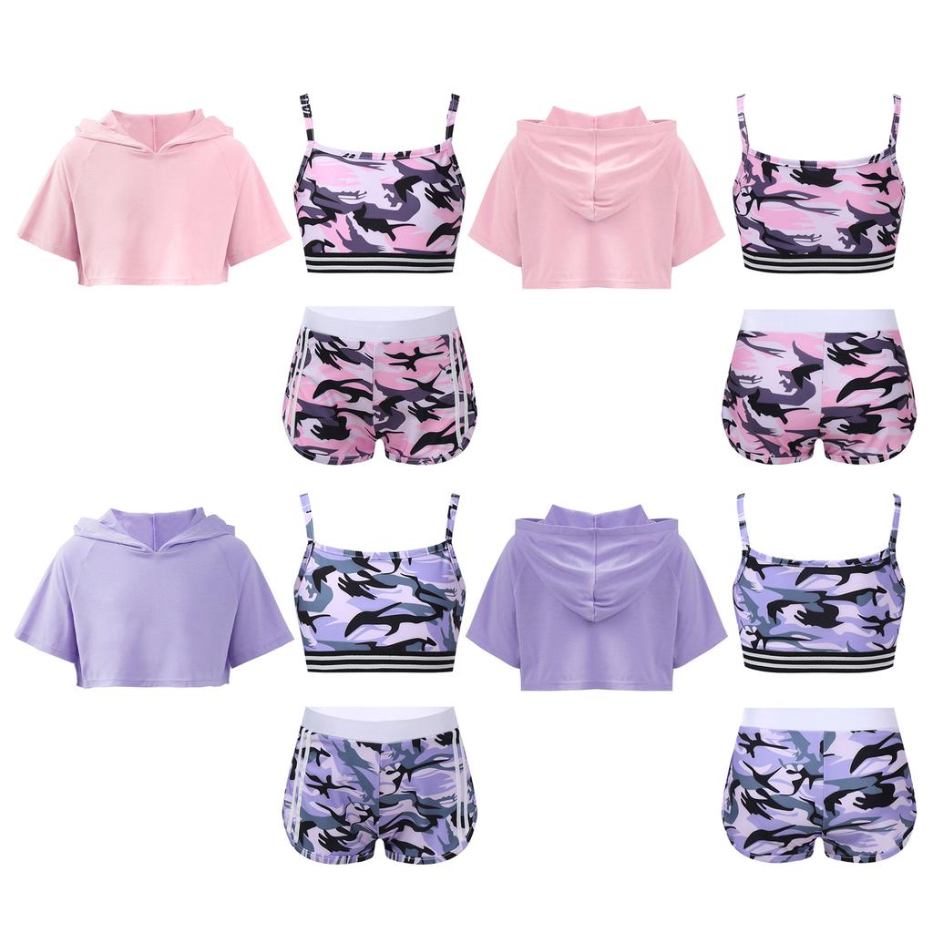 Kids Girls 3 Piece Dance Gymnastic Workout Outfit Short Sleeve Hooded with Crop Tank Top Shorts Sport Tracksuit