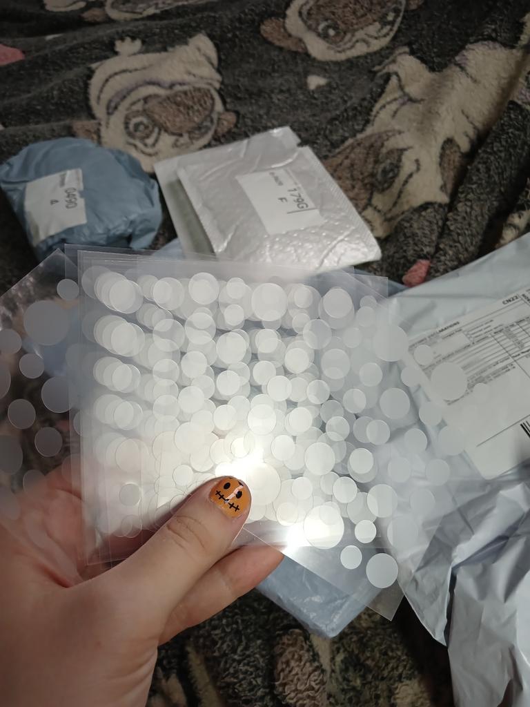 Ten clear round bandage patches. Haven't tried them yet, but they look okay.. Upd: they stick normally too. Overall, it's a regular pimple patch, just like all the others.