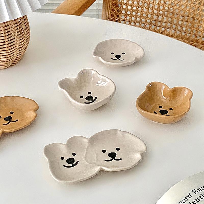 Adorable Ceramic Sauce Dish With Cute Dog & Bear Design - Single/Double Compartment Dip Bowl For Condiments, Snacks, Sushi, Soy
