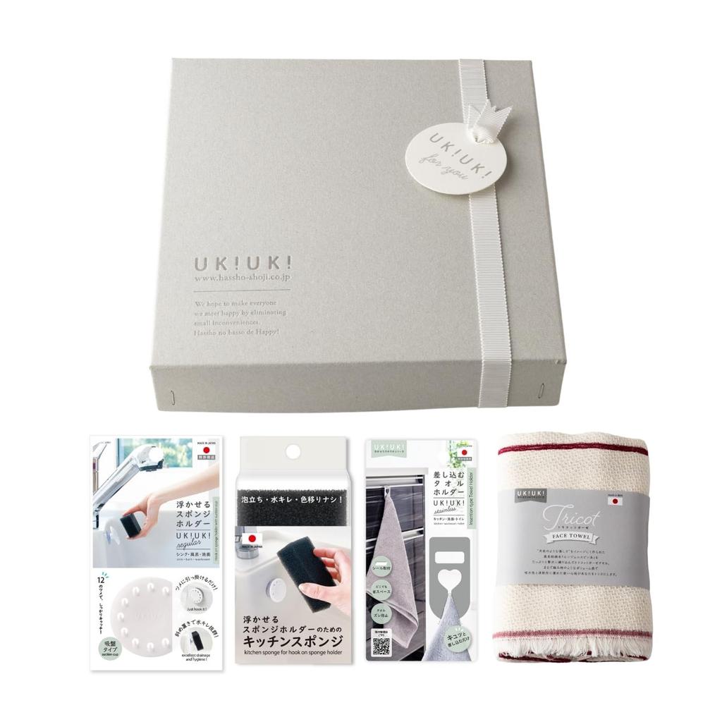 Set contents: Floating sponge holder UKIUKI (white), UKIUKI kitchen sponge (black soft type), insert towel holder UKIUKI (stainless steel), high-quality Senshu face towel UKIUKI -Tricot gauze- (red)