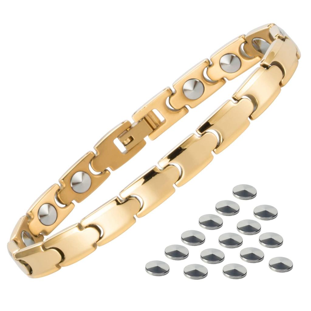 A women's bracelet made of pure titanium and 99.999% pure germanium finished in stylish gold. The bracelet is studded with 16 germanium stones, which have a positive effect on health. Features: Made of lightweight and durable pure titanium. 16 germanium stones with a purity of 99.999% are used to improve your physical condition and protect your health. Pure titanium is lightweight and comfortable to wear, and the combination of germanium stones removes static electricity and negative ions, making it comfortable to wear. The vibrant gold color will complement your style. Perfect for gifts and self-investment. Comes with a presentation box that is perfect for gifts. Material: Pure titanium, germanium Package: Comes in a gift box Note: Please be careful of allergic reactions due to your constitution. This pure titanium and germanium bracelet has the function of removing static electricity and generating negative ions, and its value is high, making it a perfect gift for lovers, family and friends.