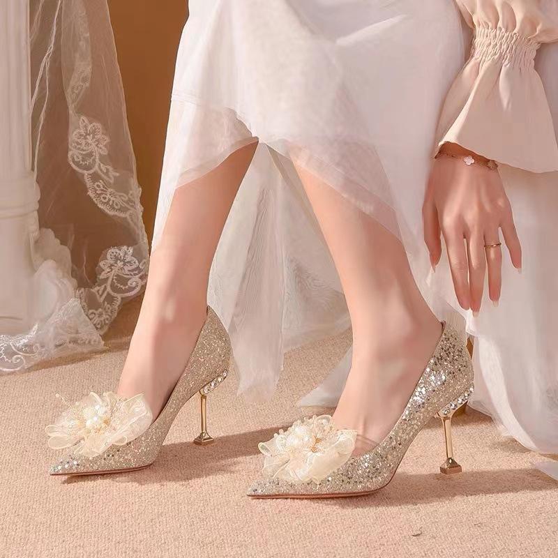 Sexy High Heels Women's Thin Heels Spring and Autumn New Temperament Socialite Bow Pointed Single Shoes Women's Flower Wedding Shoes