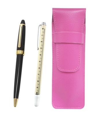 Pink Grained Leather Pen Case with Slide Measuring Stick and Slim Rotating Ballpoint Pen Blue Set, SASP-708W-PD04-L