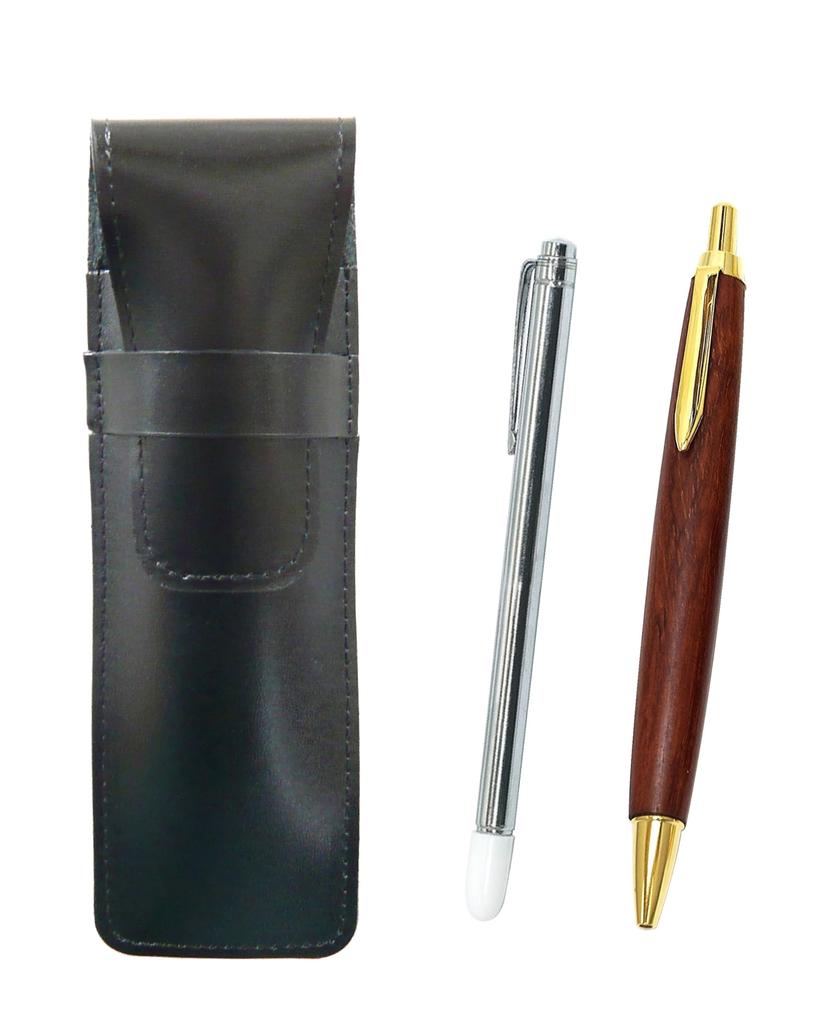Slim Black Cowhide Leather Pen Case with Metal Pointer and Wooden Retro Ballpoint Pen Set ASB-701S-HS48S