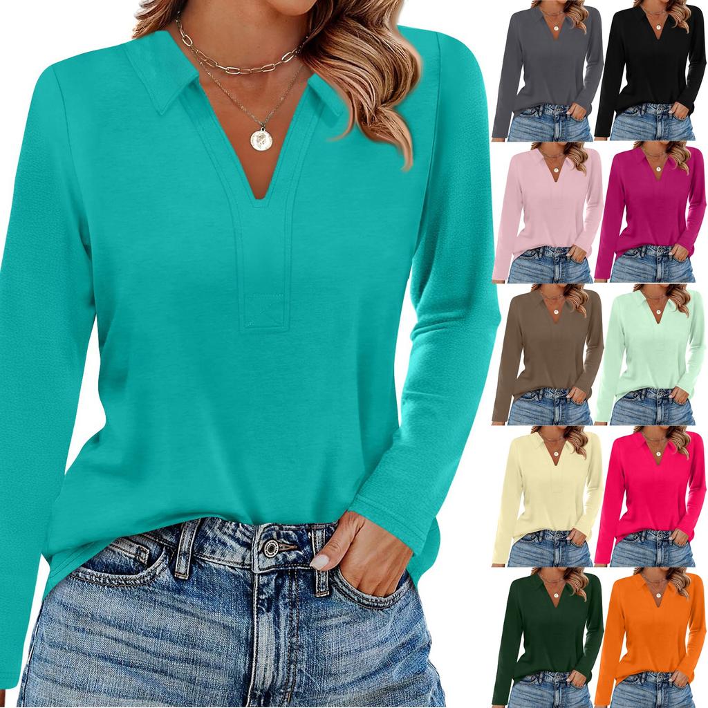 Women's Fashion Casual Lapel Short Long Sleeve Solid Color Shirt Women's V-Neck Tops