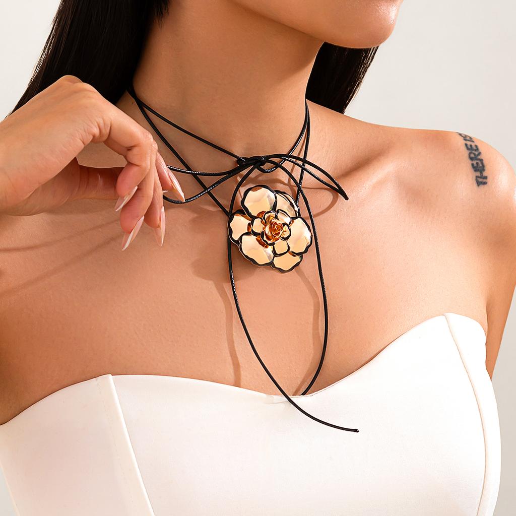 PuRui Gothic Unique Black Leather Wax Thread Adjustable Necklace Women Black Lace Dripping Oil Flower Pendant Banquet Zircon