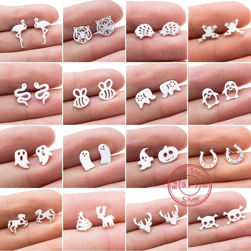 100% Real Sterling Copper 925 Fashion Stud Earrings Minimalist Hedgehog Tiger Penguin Snake Cartilage Studs Hypoallergenic Gift