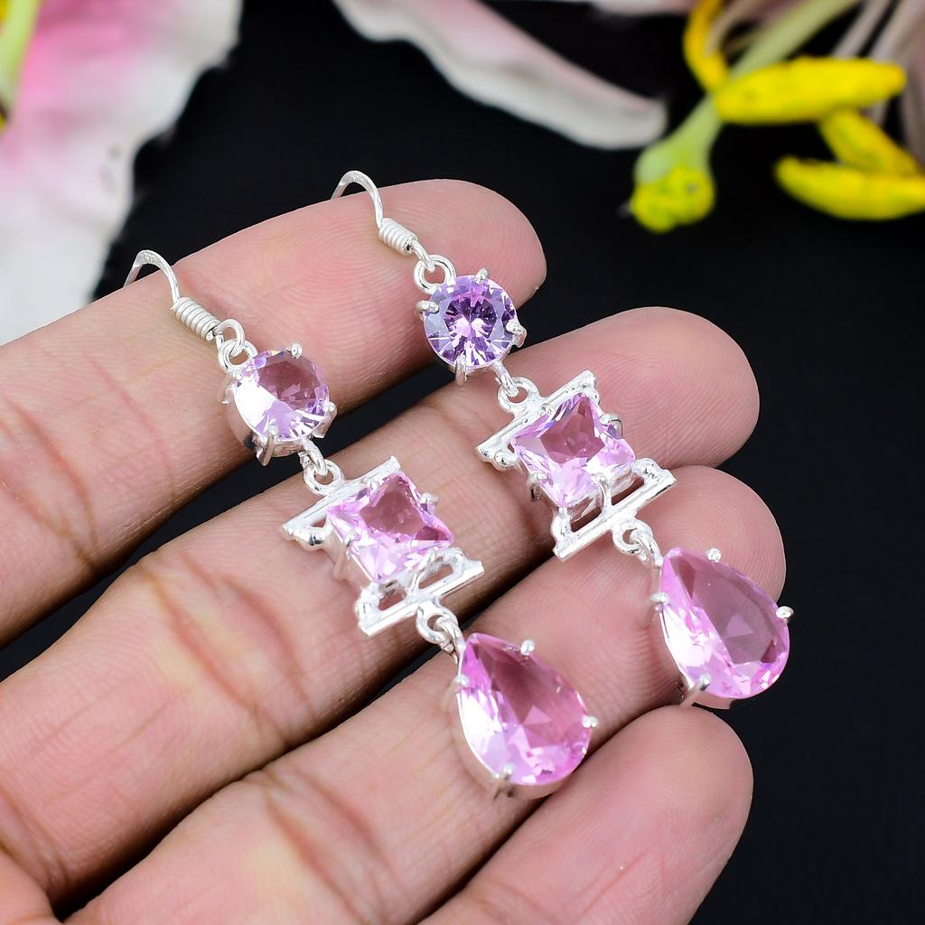 Pink Kunzite Gemstone Handmade 925 Sterling Silver Jewelry Earring 2.96" KG-433