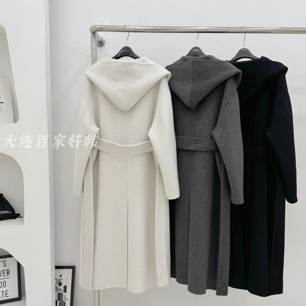Hooded Lazy Loose Double-sided Wool Coat Lace-up Bathrobe Long Coat Autumn and Winter 25 New Women's Black and White Gray