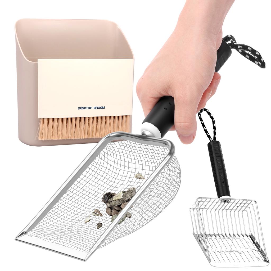 Stainless Steel Cat Litter Scooper Set with Small Broom and Dustpan Clean Non-Stick Shovel For Small Pets or Reptile Sand Waste