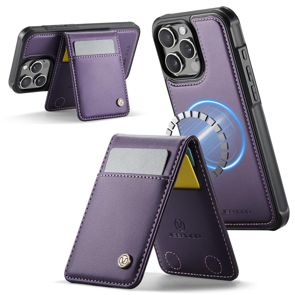For iPhone 16 Pro Max Leather Back Cover Compatible with MagSafe JEEHOOD J06 Phone Case with Card Bag RFID Blocking
