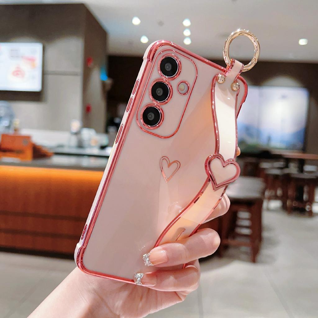 For Samsung Galaxy S25 Case Electroplated Heart Pattern TPU Phone Back Cover with Wristband Kickstand