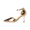 Introducing an elegant addition to your footwear collection, these Metallic Design One-Strap High Heels are crafted with a sleek pointed toe silhouette that exudes sophistication and style. Designed for women seeking a blend of glamour and comfort, these heels feature a modern one-strap design that adds a chic touch to any outfit. The footwear is constructed with a durable polyurethane upper, providing a glossy and high-quality finish. The shoes also boast a rubber sole for exceptional grip and stability, ensuring confidence with every step. Inside, the microfiber lining offers a soft and comfortable feel, making these high heels perfect for any occasion, from glamorous evenings to stylish day outings.
