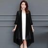 Discover the perfect blend of style and practicality with this Women's Plus Size Chiffon Cardigan Trench Coat. Crafted from soft, chiffon fabric, this mid-length coat offers a lightweight and airy feel, ideal for the spring and summer seasons. Designed with a flattering V-neckline and half sleeves, it provides comfort and elegance for middle-aged and elderly women. This versatile shawl not only adds a sophisticated touch to any outfit but also offers essential sun protection, making it a must-have addition to your wardrobe.