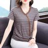 Striped Drawstring Short-sleeved V-neck T-shirt Summer Women's New Large-size Casual Pullover Top