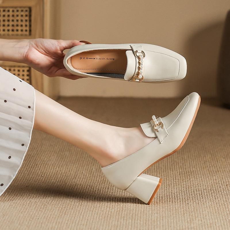 Simple Office Wear Soft and Innocent Leather Single Shoes 6 Cm Heel Tall Spring and Autumn Square Head Mary Pearl Diamond-inlaid Women's Shoes