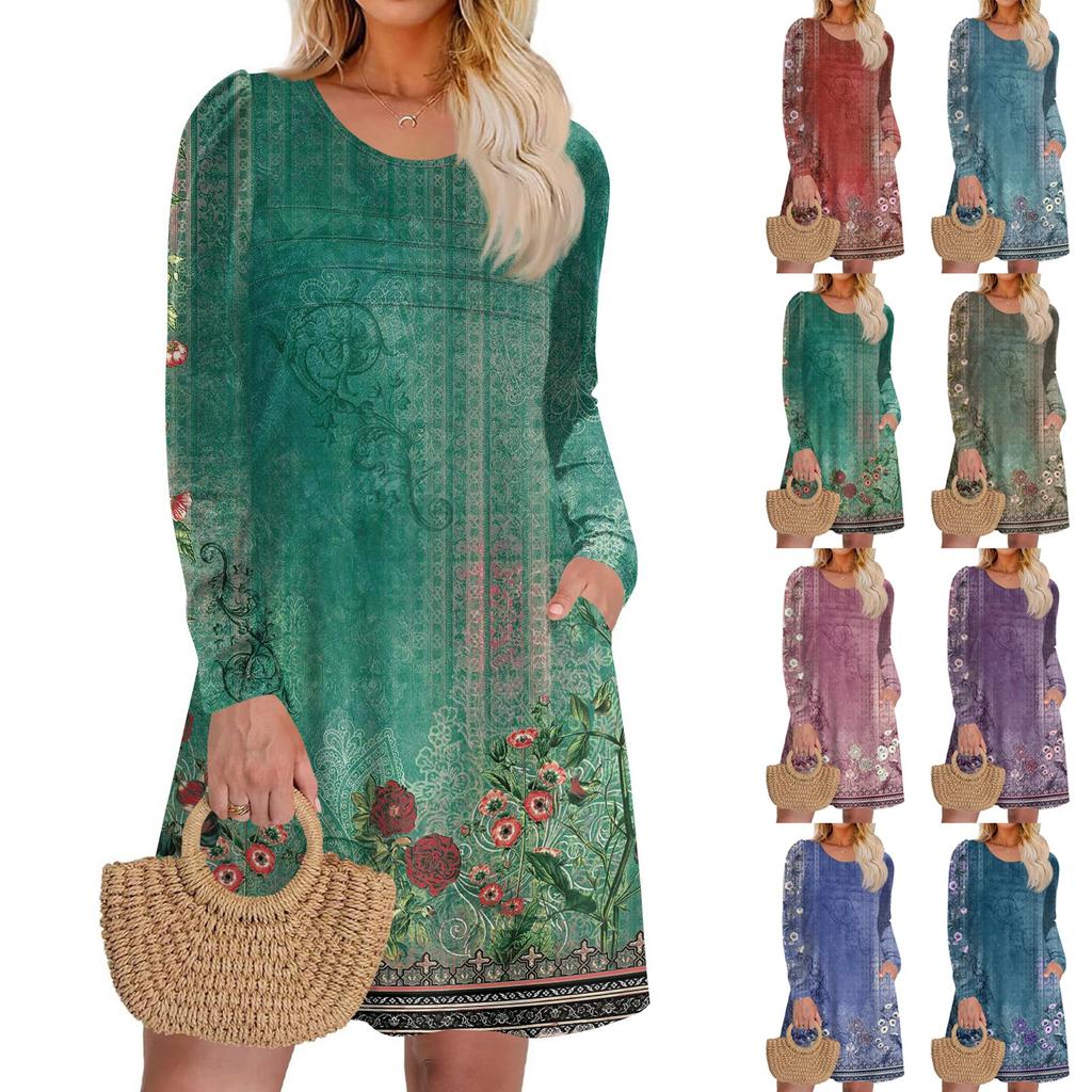Women's Long Sleeve Dress Fall Casual T Shirt Loose Fit Pleated Front Dresses With Pockets