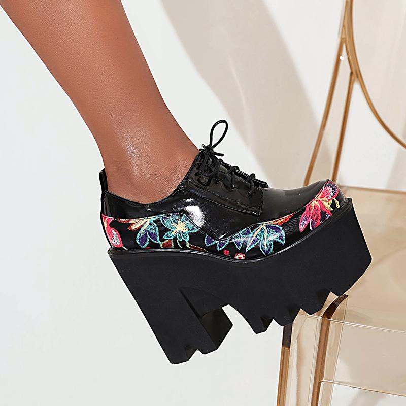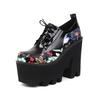 Ultra High Waterproof Platform Wedge Heel Raised Breathable Pumps Embroidered Floral Punk Style Lace Up Polyurethane Sole Pumps