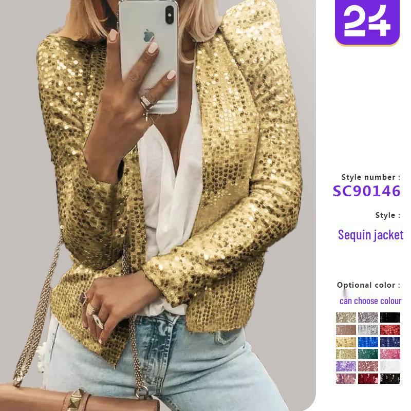 This Spring 2025 jacket is a stylish blend of European and American fashion, designed to make a statement. Crafted from high-quality polyester, this jacket offers a sleek, slim fit that flatters any silhouette. The standout feature is its eye-catching colorblock sequin decoration, adding a touch of glamour to the solid pattern. A stand-up collar adds a modern twist, while the long sleeves provide coverage for those breezy spring days. Perfect for any fashion-forward wardrobe, this jacket effortlessly combines elegance and contemporary style.