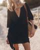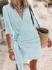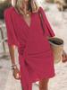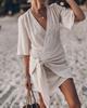 Women's Beige V-Neck Wrap Short Sleeve Dress with Waist Tie, Casual Beach Vacation Outfit