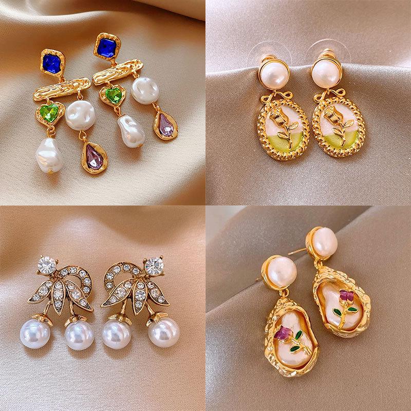 Vintage French Retro Teardrop Pearl Earrings: Court Style Silver Needle Dangles