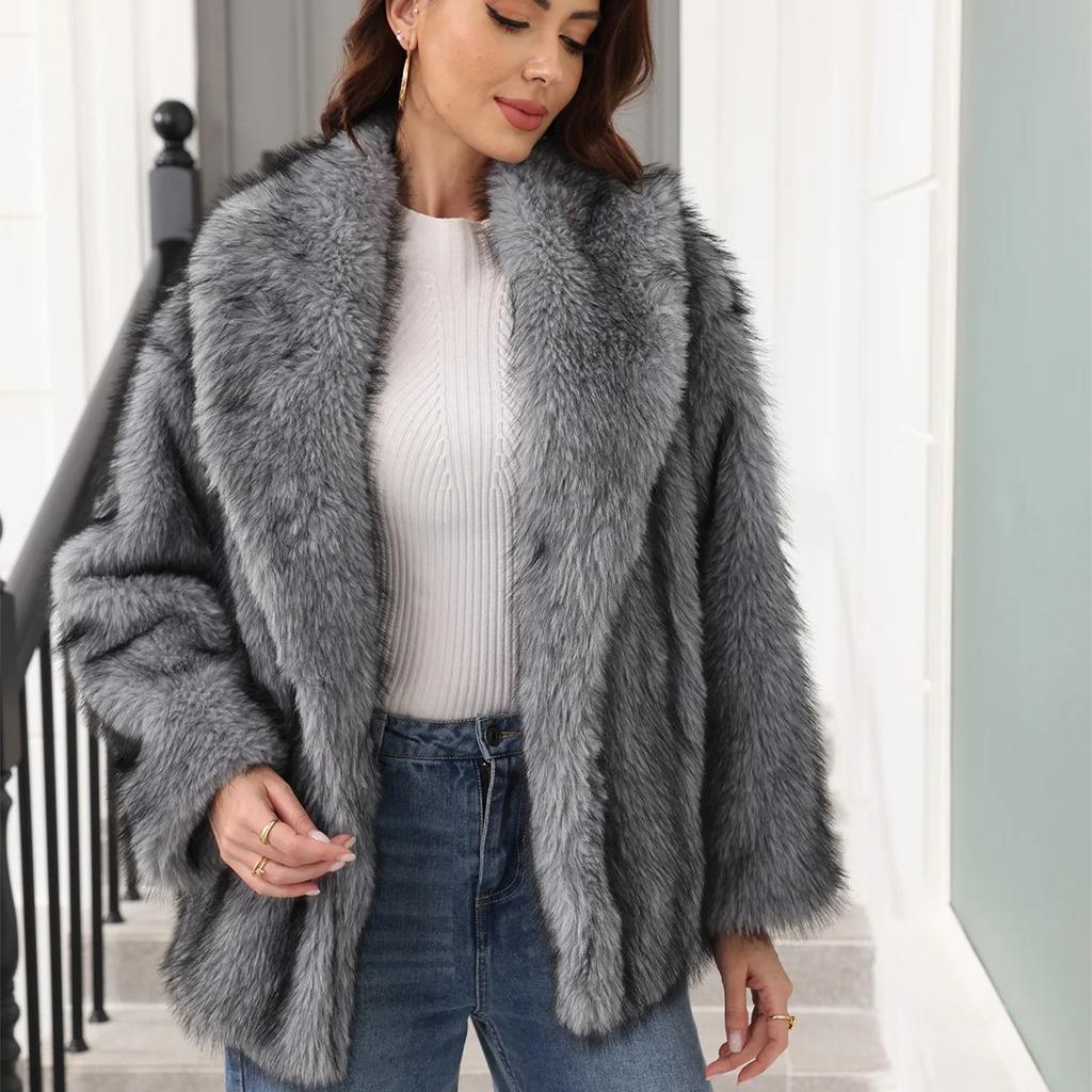 Long Faux Fur Coat Women Autumn Winter Large Jacket Overcoat Turn Down Collar Pockets Luxury Thick Coat Warm Jackets Maxi Coats