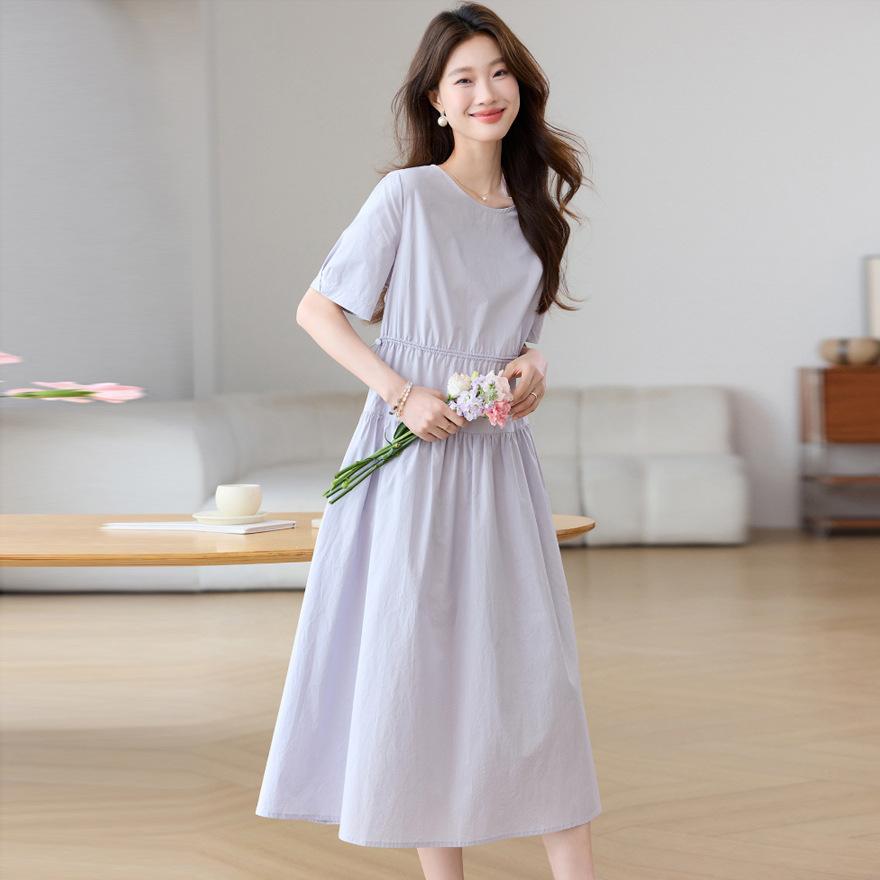 Summer New Fashion Design Sense Simple Skirt Loose Drawstring Waist Thin Short Sleeve Pure Cotton Dress Women