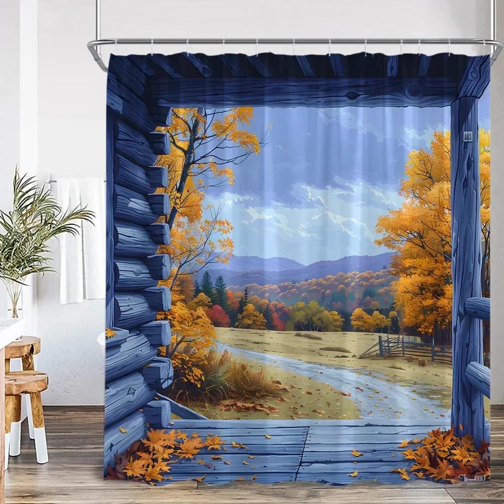 Autumn Landscape Shower Curtain Maple Forest Waterfall Landscape Tree Bathroom Decoration Polyester Bathtub Curtain