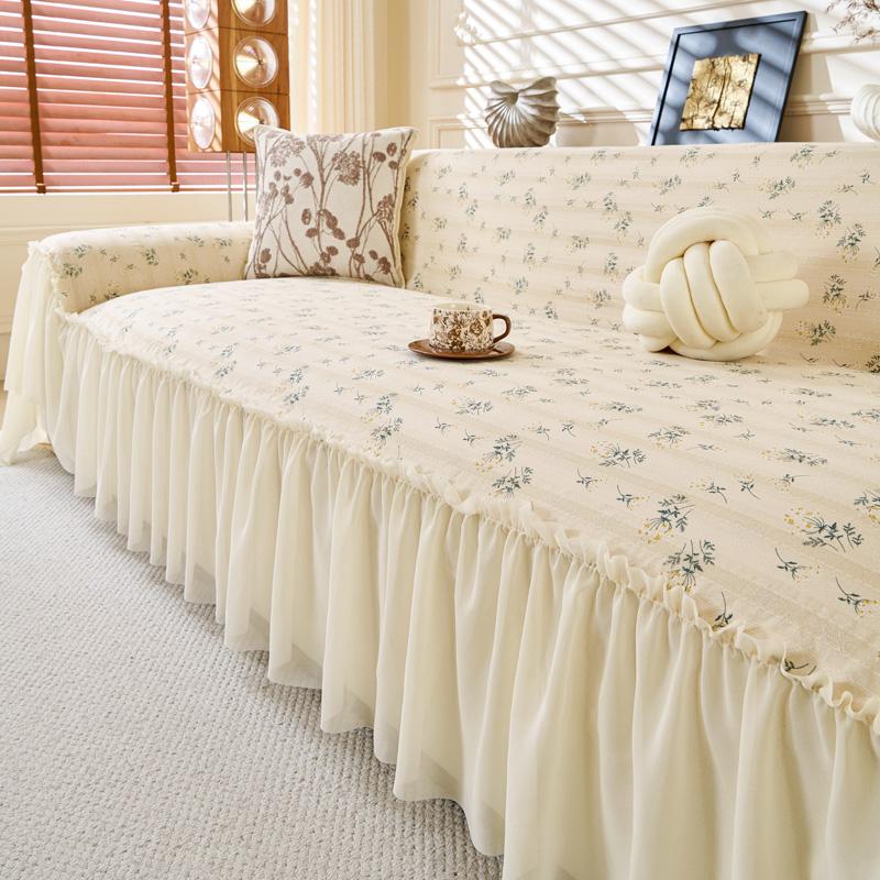 Polyester Linen Sofa Cover Ruffled Edge Creamy Style Floral Pattern Anti-Slip Cooling Couch Cushion Mats
