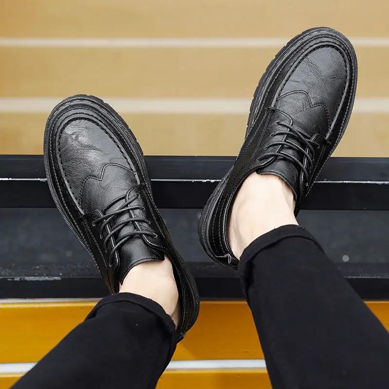Office Men's Leather Shoes Black Round Toe Male Casual Brogue Shoe Social 2025 Trend Cowhide Low Price Free Delivery Shipping Pu