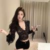 American Spicy V-Neck Lace Long Sleeve Women's Autumn Slimming Top