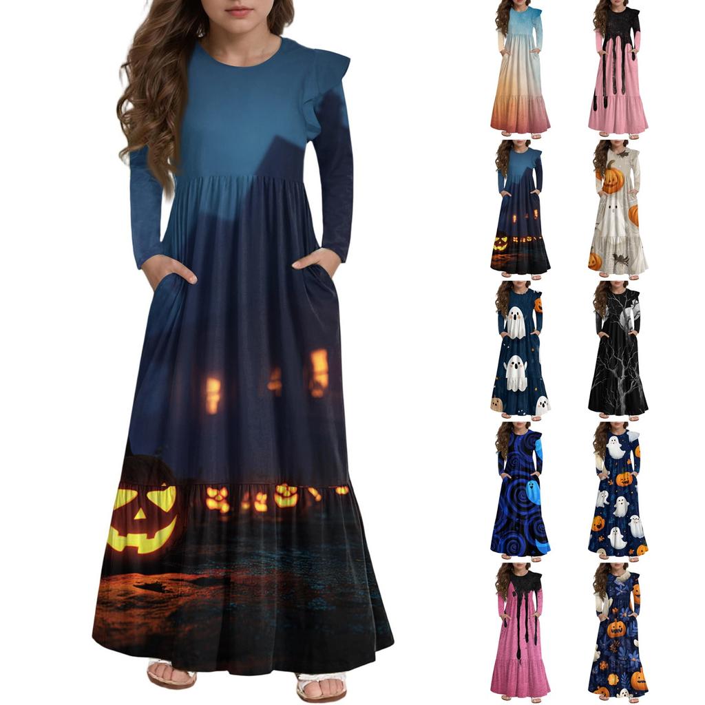 Girls' Tiered Ruffle Dress Halloween Day - Long Sleeve Printed Maxi With Pockets