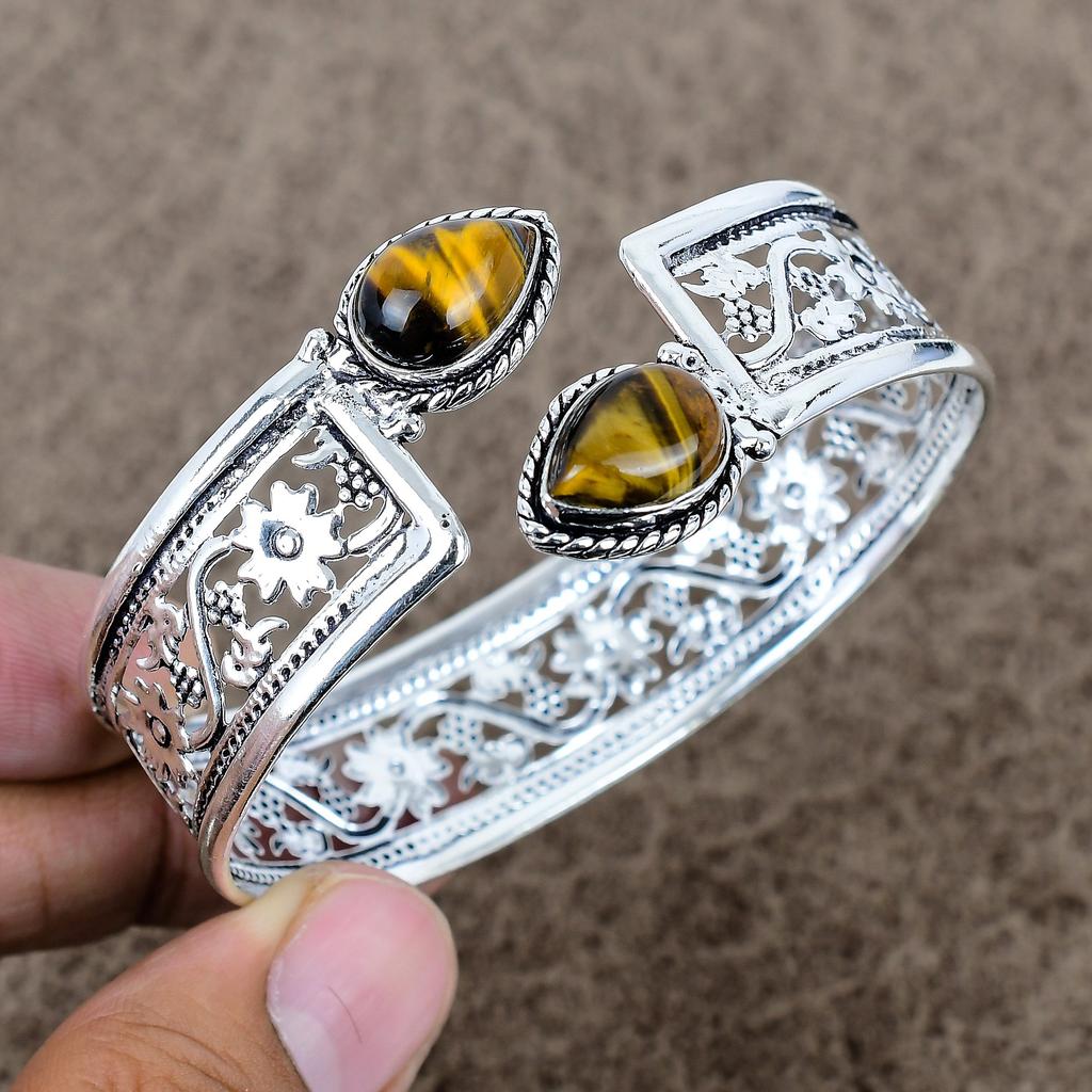 Tiger Eye Gemstone Handmade 925 Sterling Silver Cuff Bangle Adjustable KKG-774