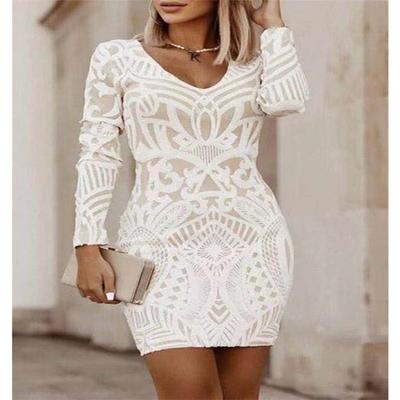 Lady Club Dress V Neck Sequin Long Sleeve High Elasticity Sheath Dress