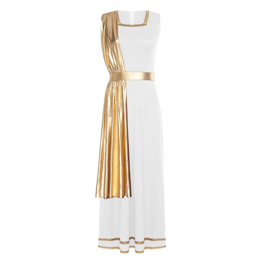 Womens Greek Roman Tunic Dress Square Neck Sleeveless Gold Trim Metallic Shiny Drape Robe Toga Halloween Costume