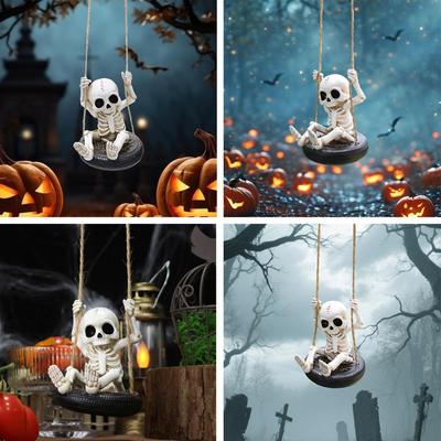 Halloween Resin Skeleton Swing Ornament Skeleton On A Tire Swinging Decoration for Car Rearview Mirror Garden Yard Tree Decor
