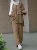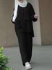 This stylish two-piece set combines elegance and comfort, featuring a long sleeve shirt adorned with practical patch pockets and matching elastic waist pants. Crafted from durable polyester, this ensemble offers a sleek look ideal for various occasions, while ensuring ease of movement and a comfortable fit.