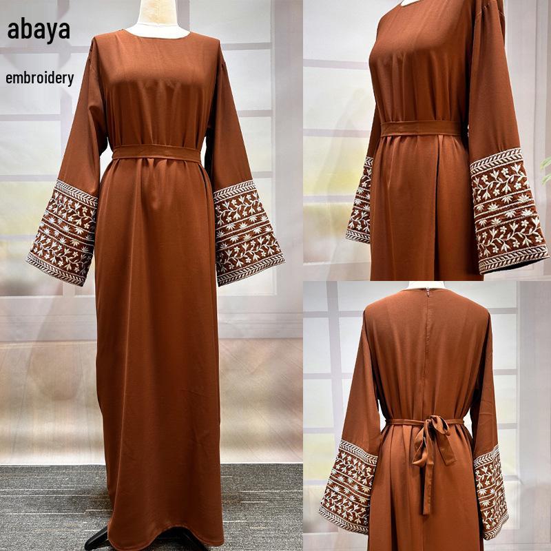 2025 Middle East Muslim Fashion Embroidered Cardigan Dress with Waistband & Pockets