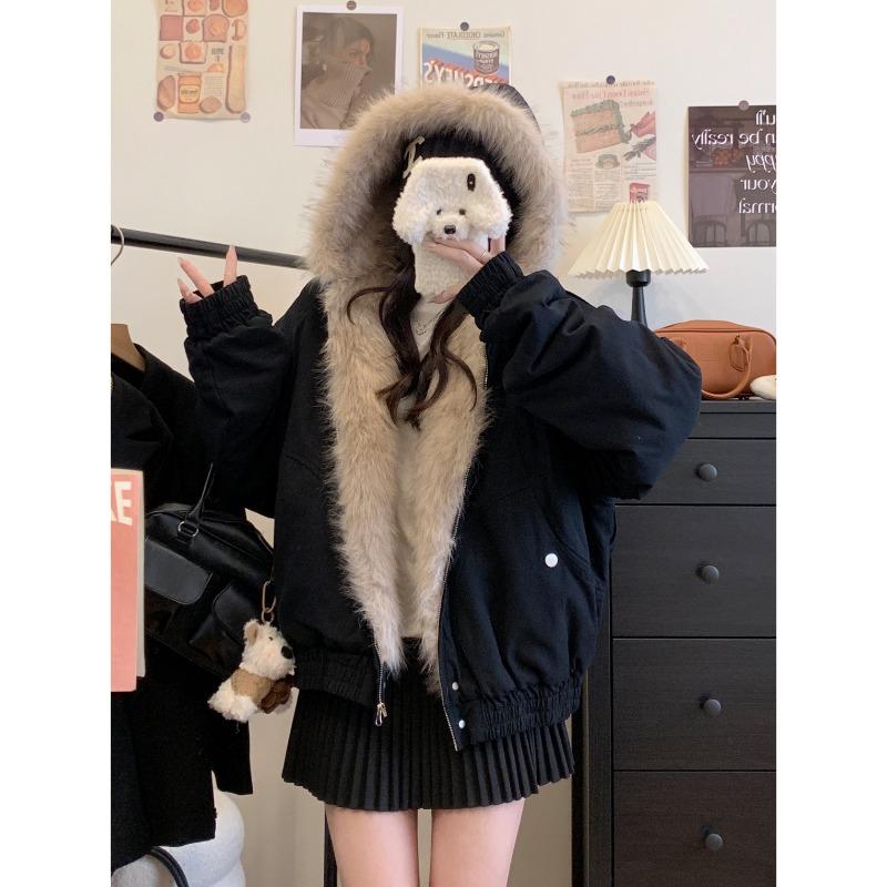 Winter Short Hooded Parka with Big Fur Collar Thick Cotton Jacket for Women
