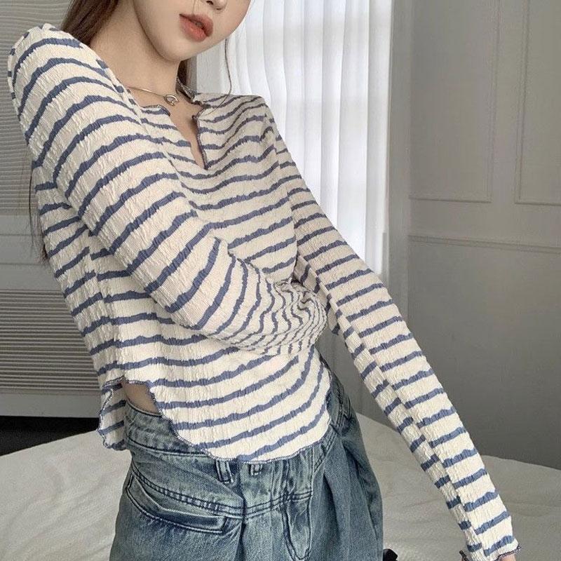 Irregular V-neck Striped Long-sleeved T-shirt Women's Autumn Winter New Slim Bottoming Shirt Short Top