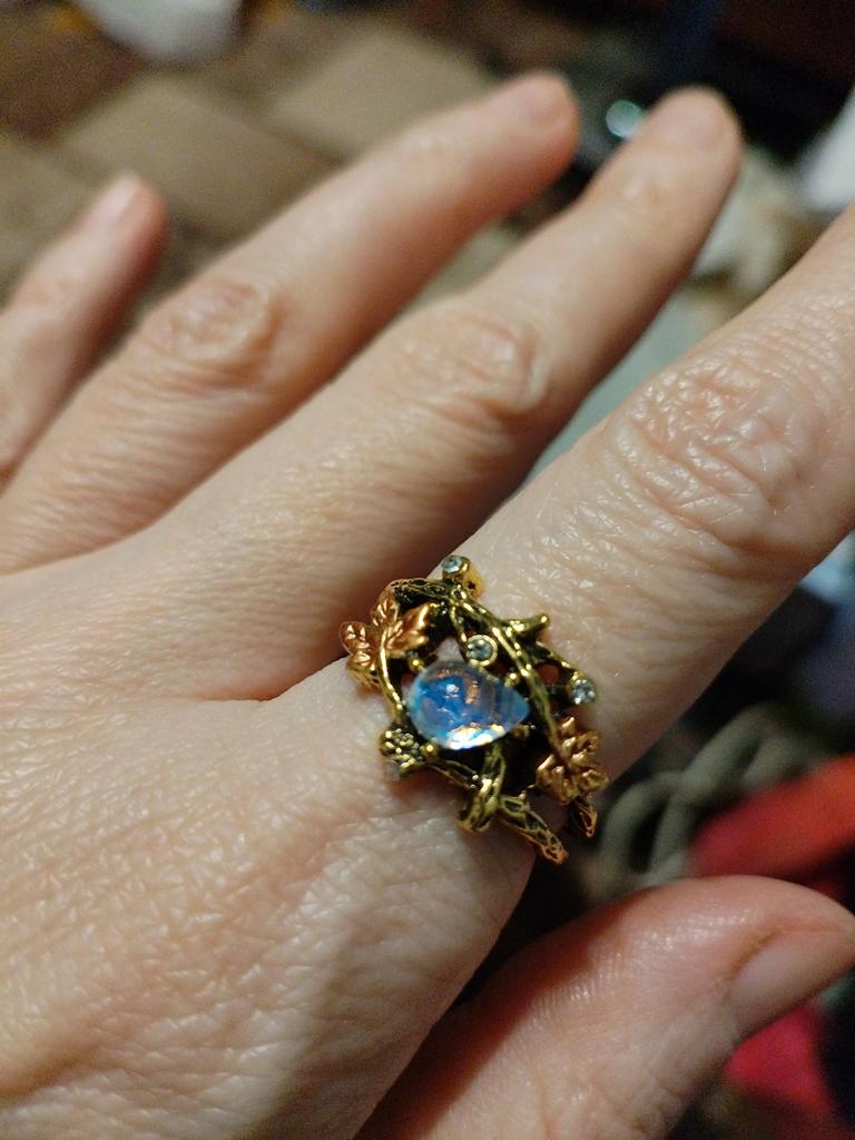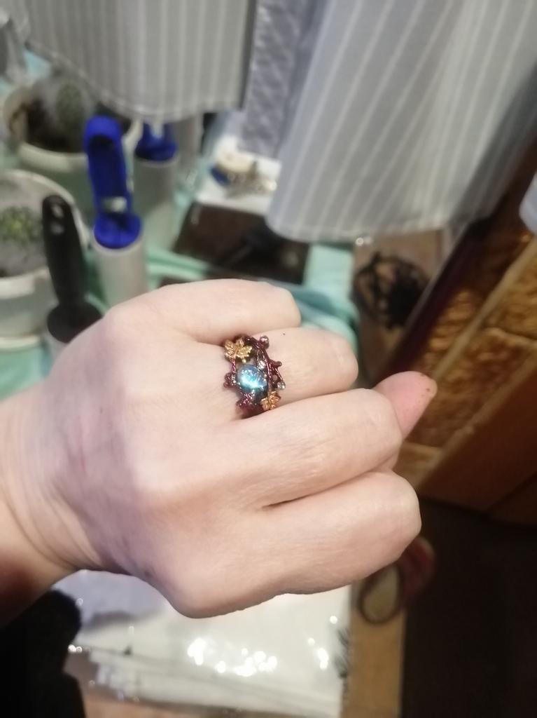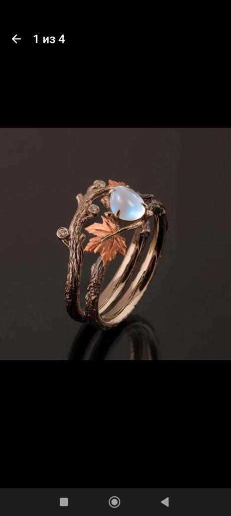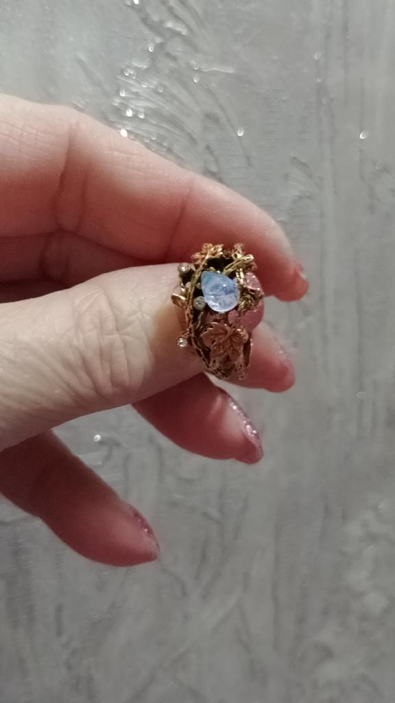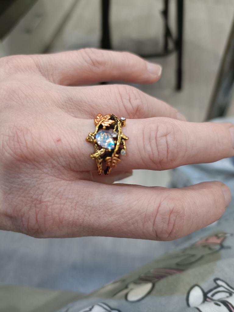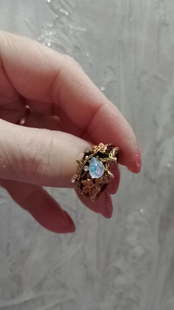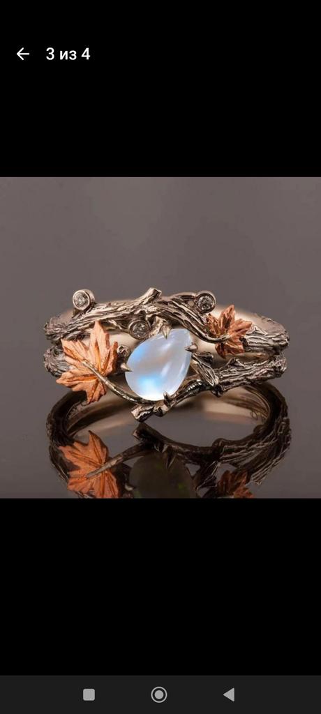 In the photo, the ring is made of a dark material imitating twigs. The ring that arrived is made of light metal, the leaves are small, the stone is not moonstone, but just glass. It would be better to have honest photos. Why invite so much negativity upon yourself for deception?