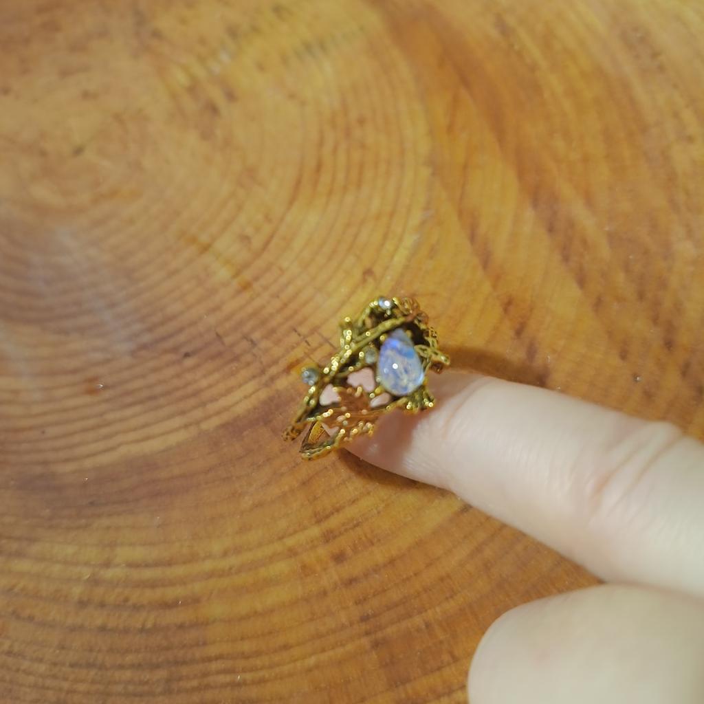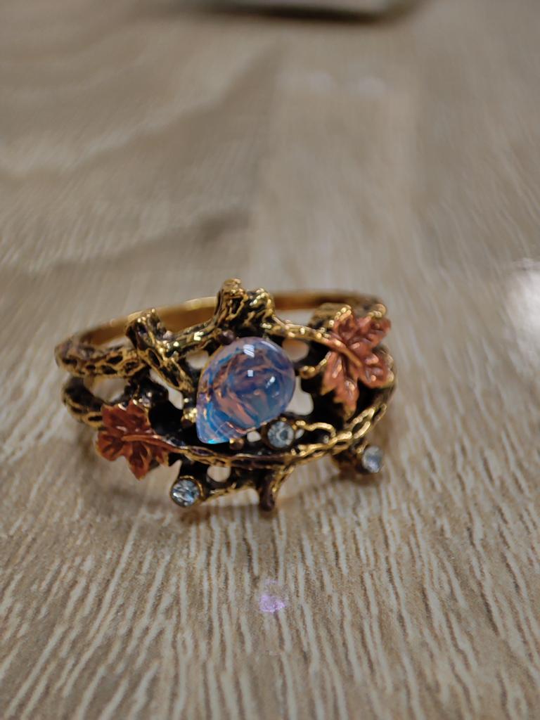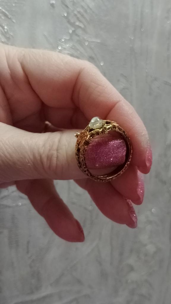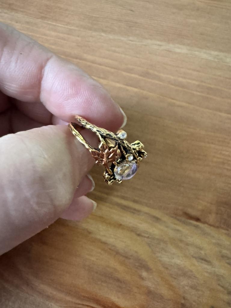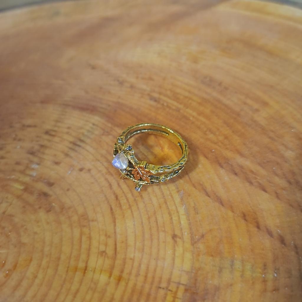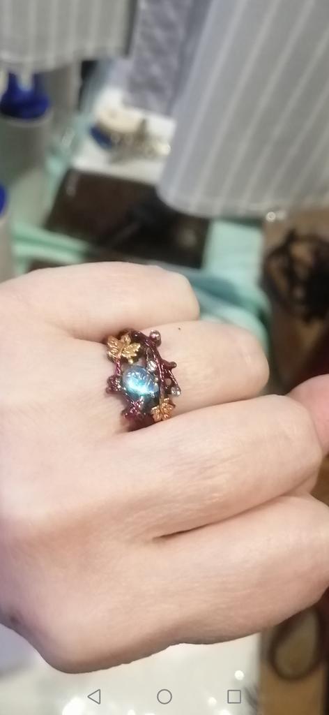 In the photo, the ring is made of a dark material imitating twigs. The ring that arrived is made of light metal, the leaves are small, the stone is not moonstone, but just glass. It would be better to have honest photos. Why invite so much negativity upon yourself for deception?